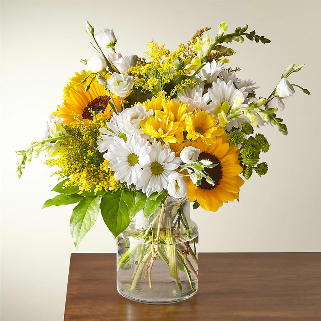 Give a dose of sunshine in bloom. This stunning bouquet is teeming with rays of sunflowers, textured snapdragons and darling daisy poms to deliver the perfect pick–me–up for an occasion or as a treat to yourself.